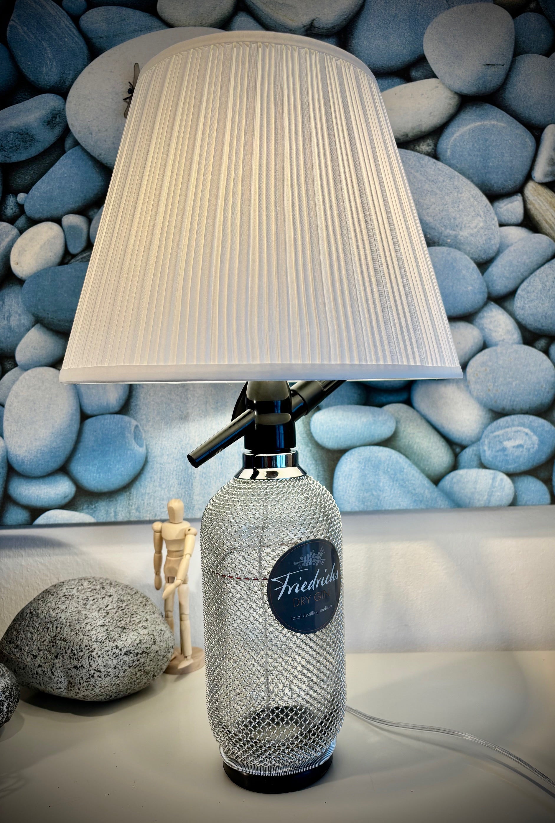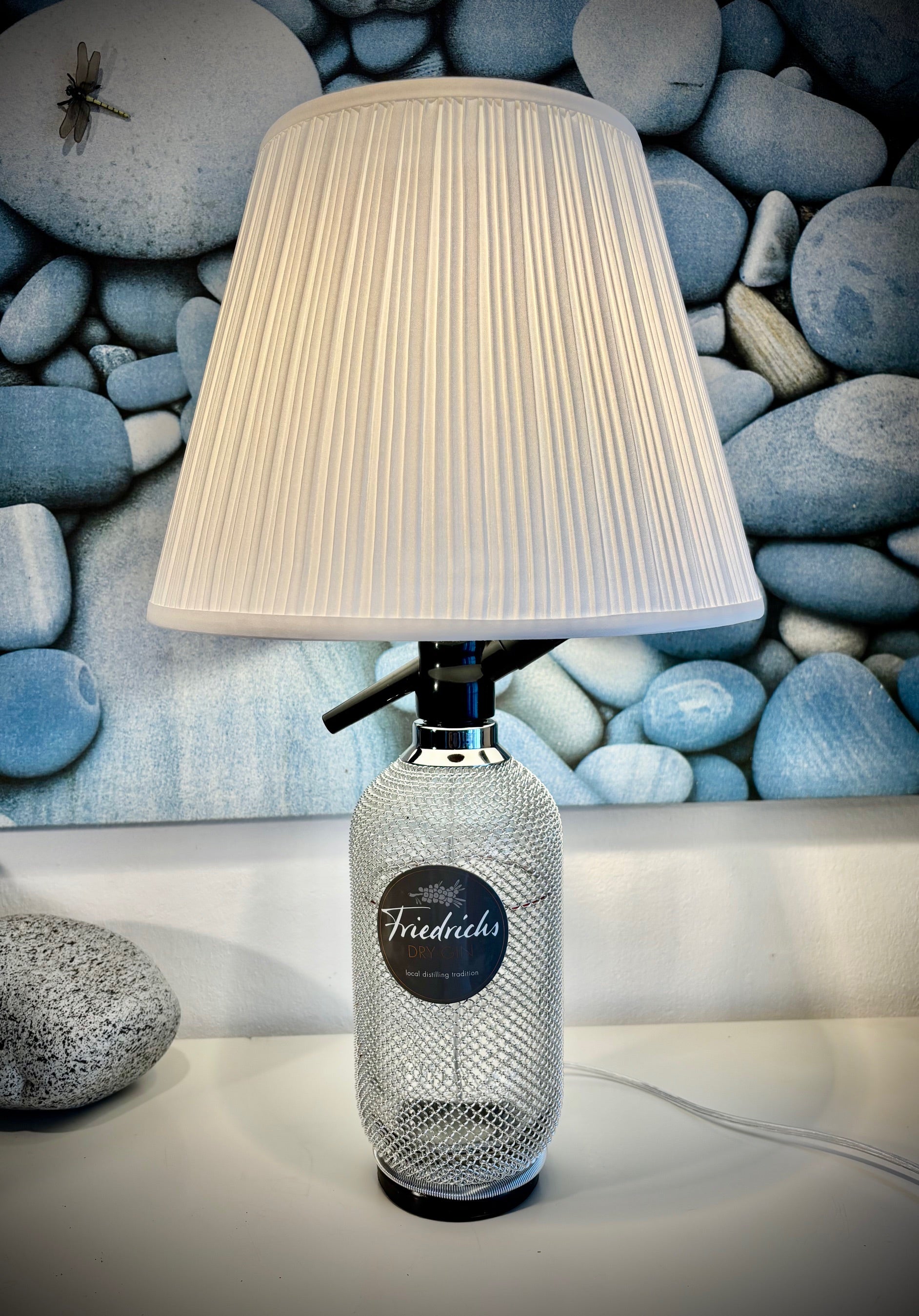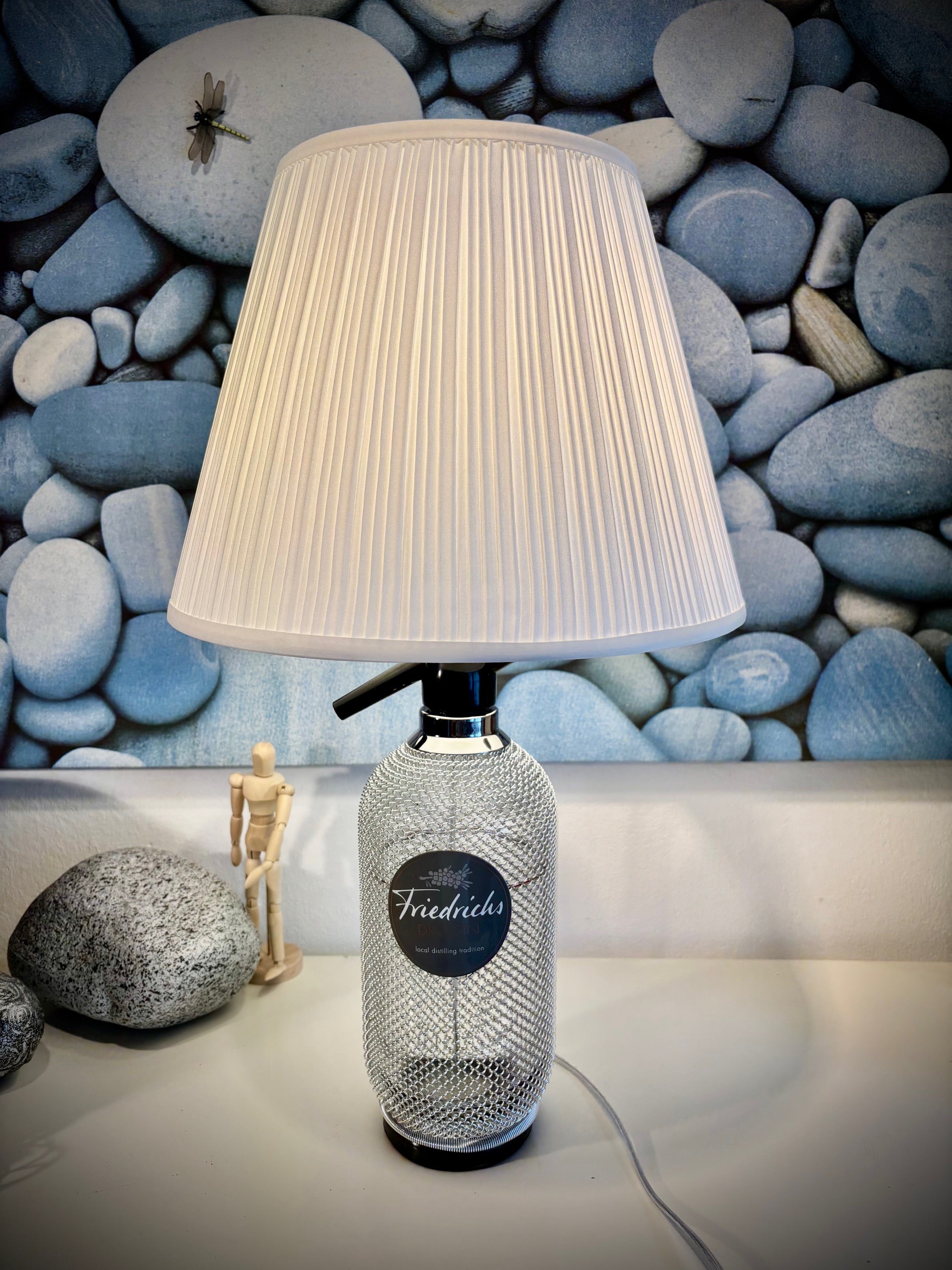 Wunderschöne Siphon Flasche mit feinem Gitternetz. Die Flasche hat einen weiss runden drapierten Lampenschirm.
