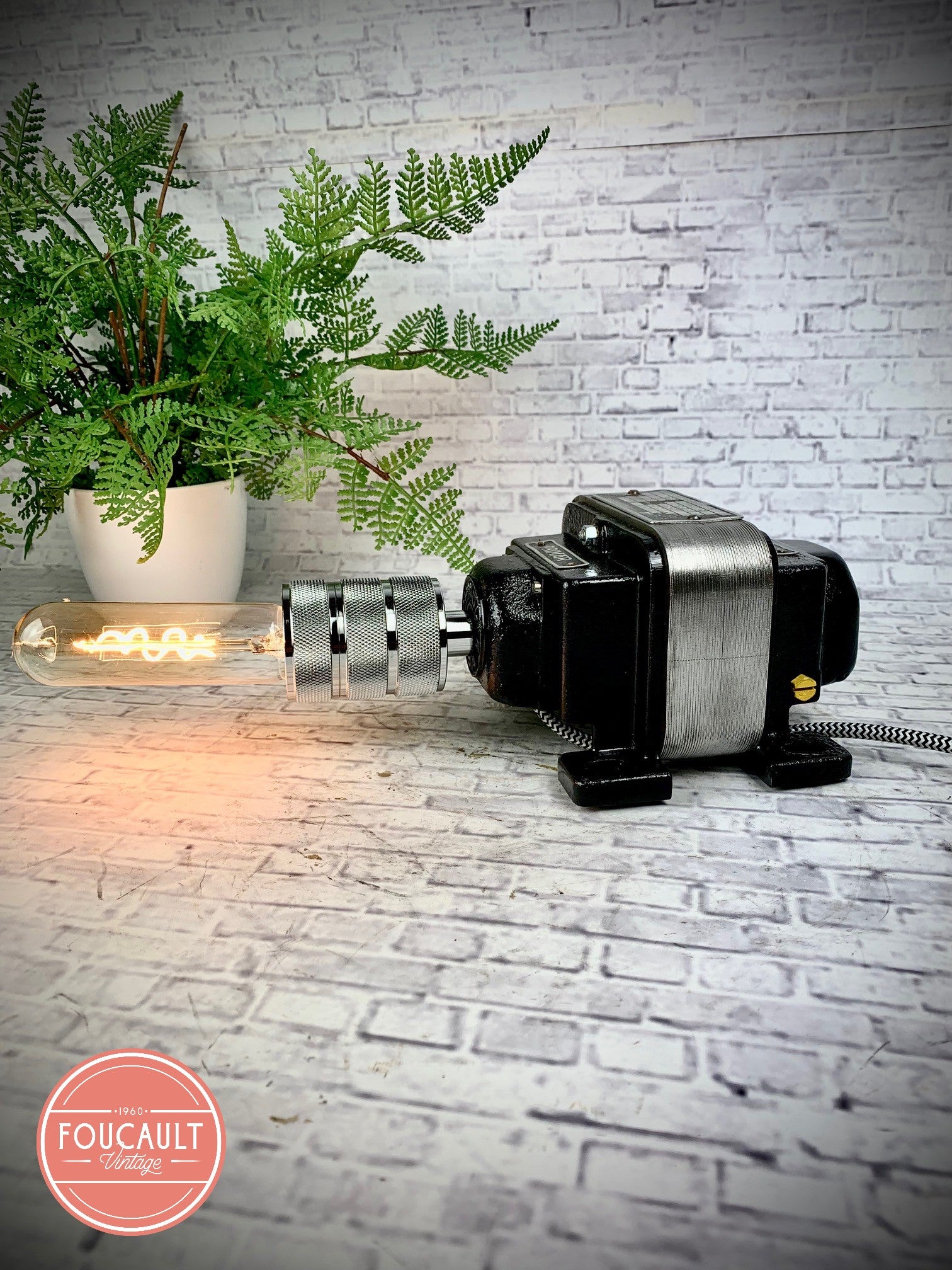 Dieser antike Transformator ist als Tischlampe konzipiert. Das verwendete Stoffkabel verfügt über einen Kippschalter und ist mit einer Vintage-Glühbirne ausgestattet.